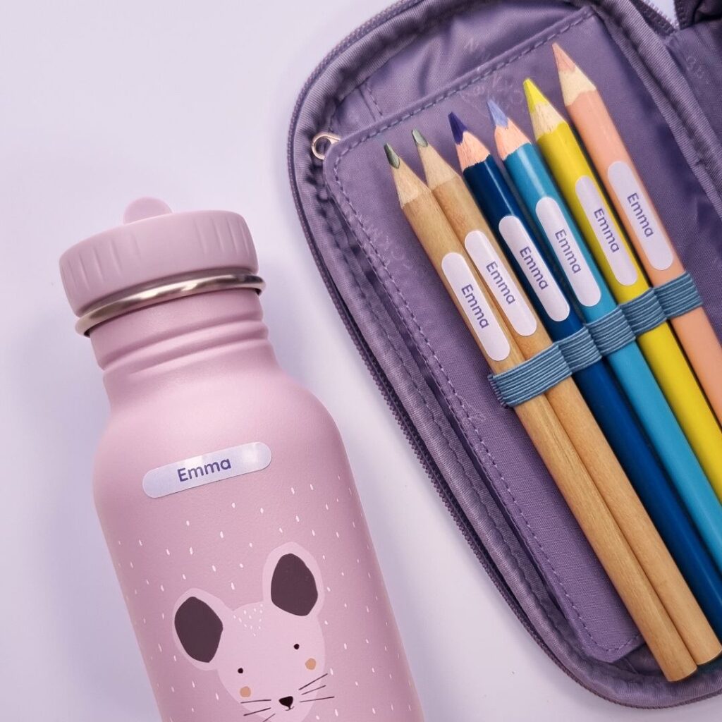 Navnelappene fra Lappeliten er selvklebende og enkle å feste på det meste du ønsker å sette navn på, som for eksempel klær, matbokser i plast, drikkeflasker av stål/metall og glass.