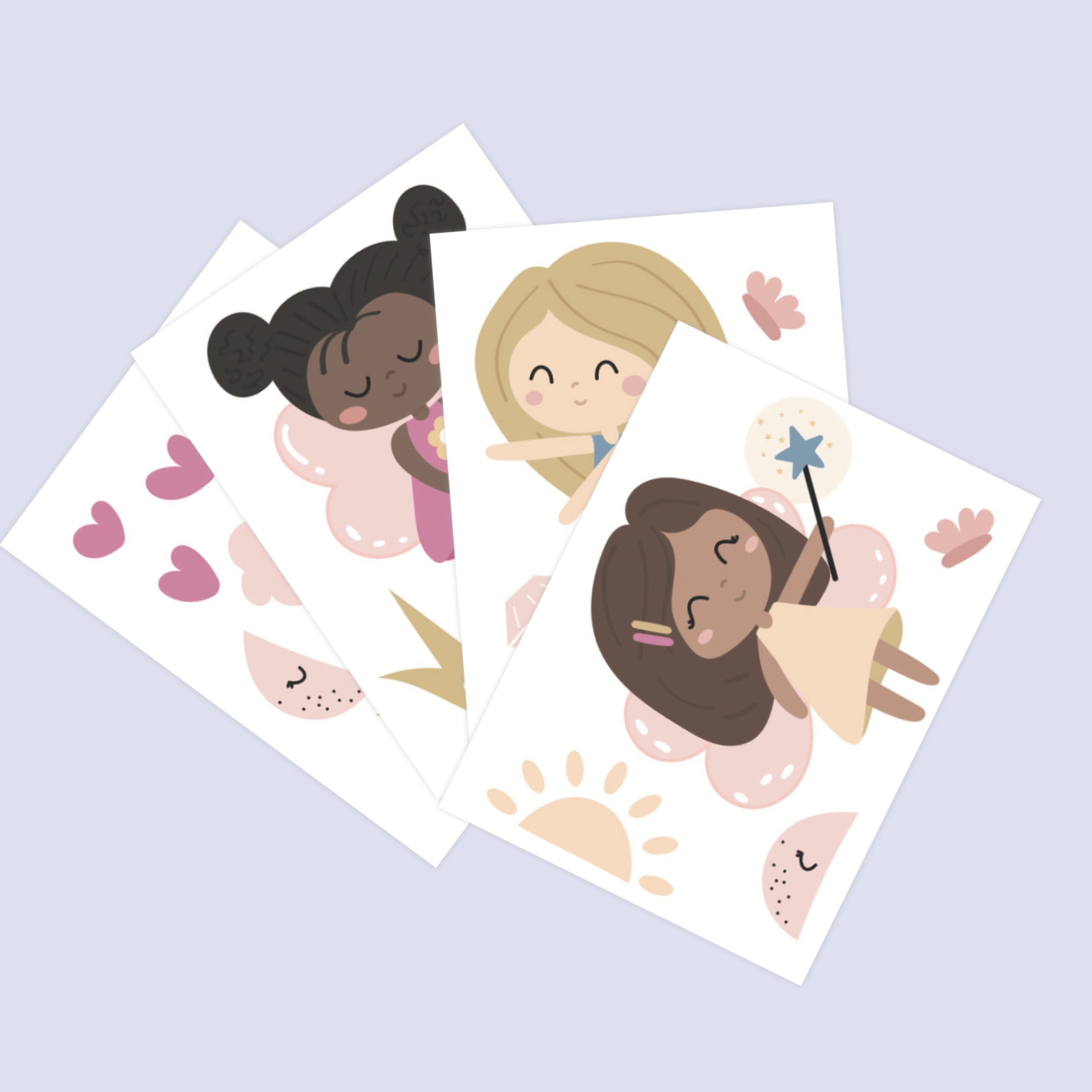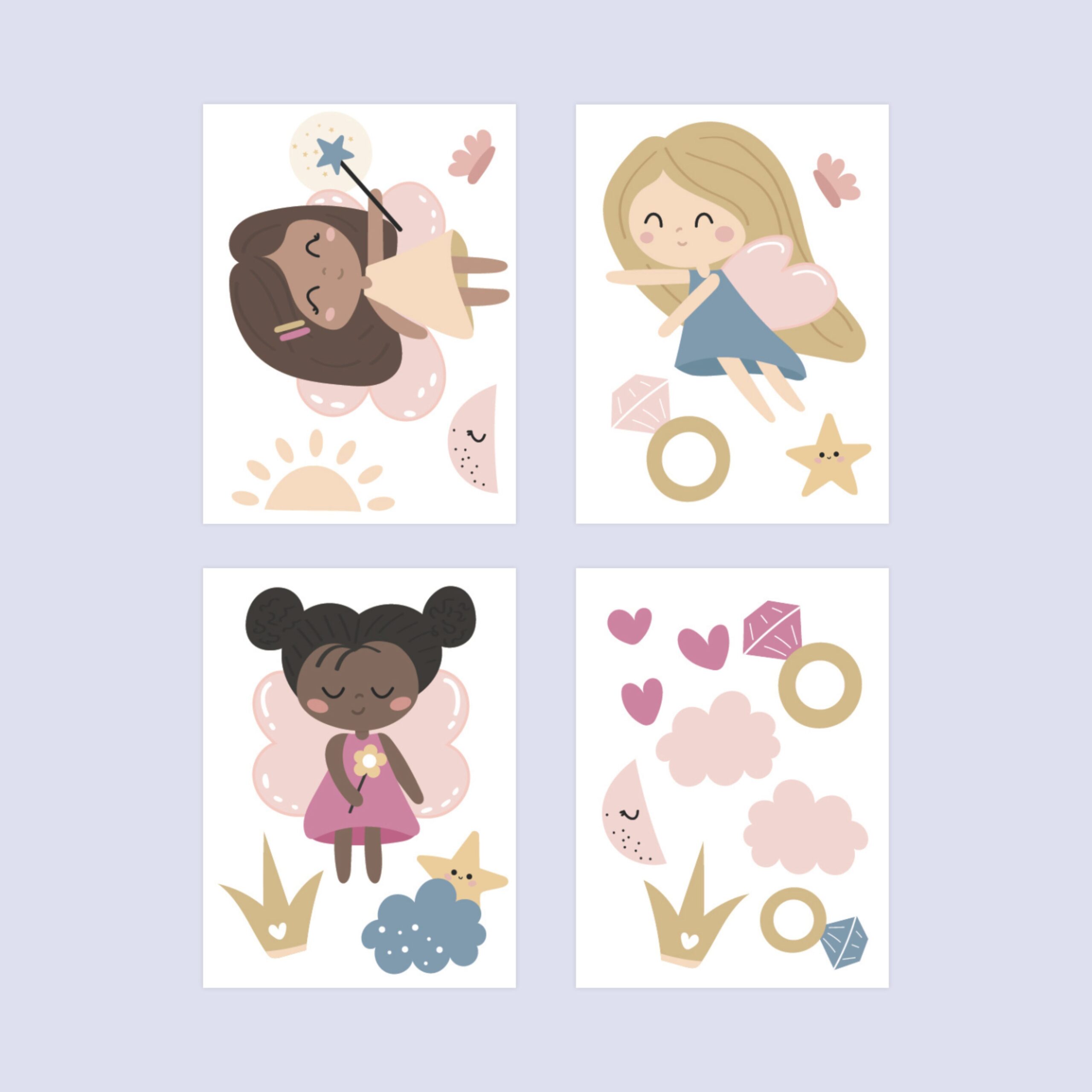 Du har kanskje hørt om de tre gode feene? De passer på prinsessen og bruker magien sin for å beskytte henne. I denne pakken får du tre feer med søte detaljer som fyller rommet med magi og fantasi. De er enkle å plassere, flytte og tilpasse akkurat slik barnet ønsker.